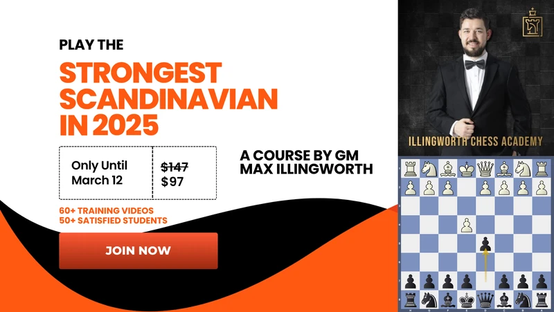 If you are interested in 'Play The Strongest Scandinavian In 2025', I recommend getting in soon, because the price will go up on March 12, 2025. You can find out the details of what's in the course (and how it will help you improve your chess as well as giving you a lifetime weapon vs. 1.e4 you're confident in) here.