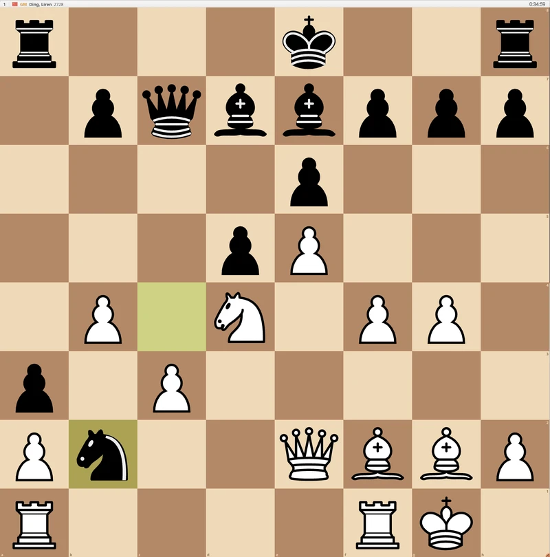 In particular, the Lichess compressor noted one massive blunder by Ding: 18. ... Nb2??. This is the 47th best move out of 49 available moves in the position. Insanity. The Lichess compressor recommends the far better Nxe5!!.