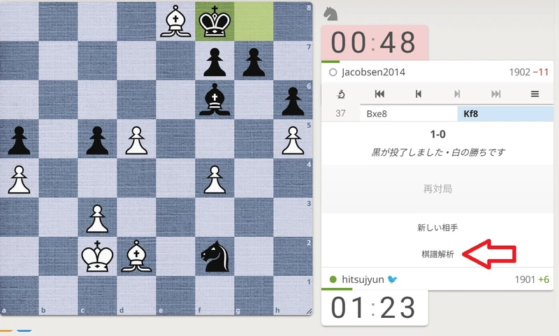 37...Kf8 で相手がリザイン(投了)した局面です。