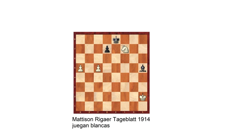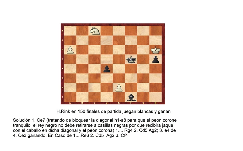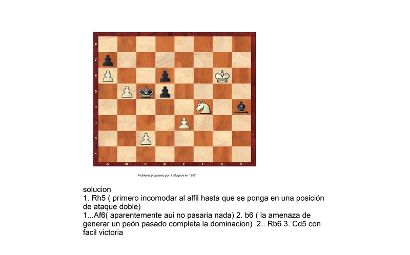 Juegan blancas y ganan solucion 1. Cc3 Ac4; 2. Ce4( el caballo combinado con el peon de h5 paralisan al rey negro) Aa6 3. Re2! y cual quier movimiento del alfil ser atrapado, este tema se conoce como dominacion por que en la posicion el alfil esta dominado por el caballo.