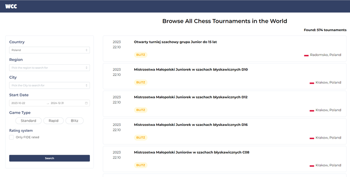 That's it! You can now filter out what do you want, click on any tournament and get navigated to it's source. For Poland it's mostly local sites such as chessarbiter or chessmanager. For other countries it's oftentimes chess-results. And many-many more, we are constantly working on expanding our source and country lists