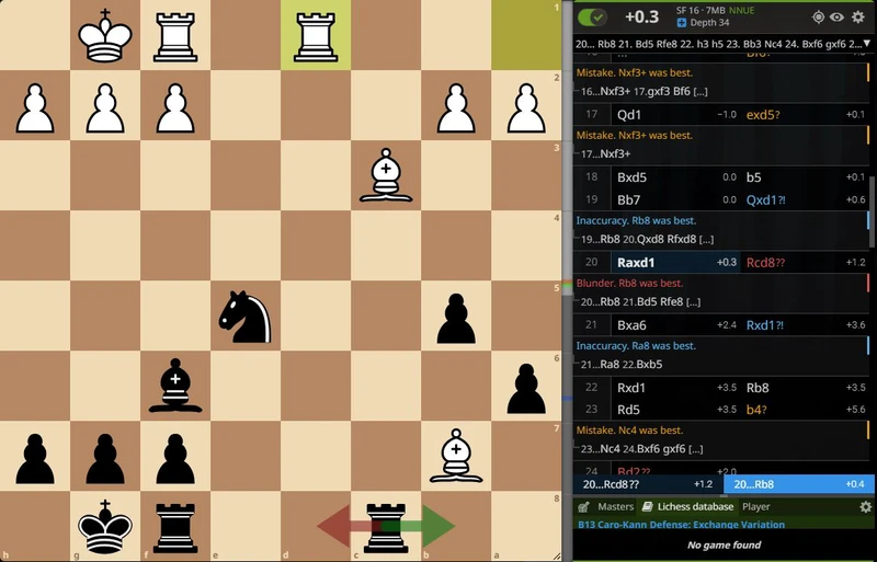 Here's another example of a 'blunder' midway through my game...which eventually led to my demise. In this example, the computer engine said we were at near even strength (+0.3). White had a slight advantage. I was playing the black pieces. White had just moved the bishop to b7. On my 20th move, I made the move Rcd8- a blunder. The better move was Rb8. I remember considering the move Rb8, but I thought the white bishop would take the a6 pawn regardless. What I didn't realize is that I could have possibly trapped the white bishop if it did capture the pawn on a6.