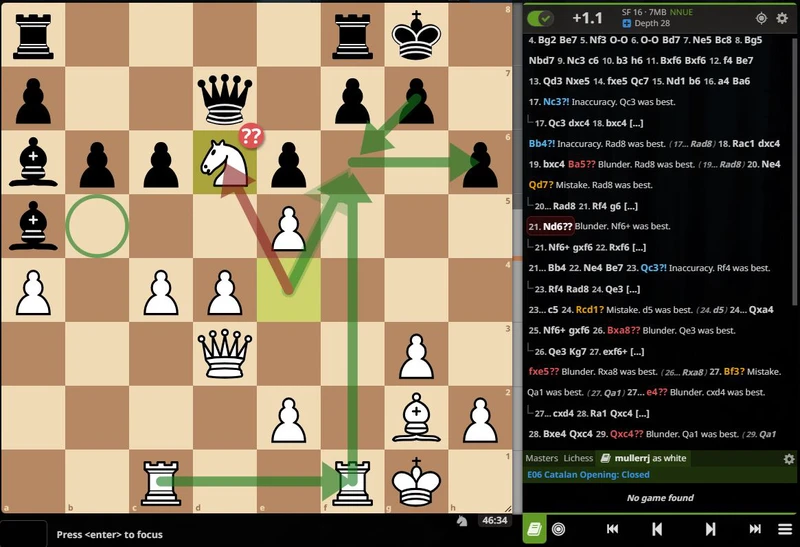 Here’s a good example of playing a less risky move in a game. I just played this game last night (against Lichess SF5) where I thought I was playing well, right up until the time I blundered. I blundered because I made the less risky candidate move. I was playing the Catalan Opening (white pieces) which is a relatively new opening for me. I played the opening well. That is, I did everything I wanted to do: I controlled the center, I developed my pieces, I castled, etc. On my 21st move, I made the move: 21. Nd6?? I remember it being 1 of 3 candidate moves I considered making. My thinking was to defend against a potential battery by black on the d-file and to protect the b5 square- as I was anticipating black making the move: 21...b5. I wasn’t crazy about black’s bishop pair on that side of the board either and figured if there was an exchange, I’d be able to capture black’s light squared bishop with my knight. One of my other candidate moves, that I failed to make, which obviously was the best move was: 21. Nf6+. This move forks the black queen and king. To save the queen, black’s only response is to capture the knight with their g-file pawn. 21...gxf6. Yes, there was a risk where I would have had to sacrifice my knight, but look at the reward. On the next move, I would have captured with my rook: 22. Rxf6. From there, I would have captured the h-file pawn, etc. With my supporting pieces (queen, rook, bishop) I would have most likely threatened checkmate soon thereafter.