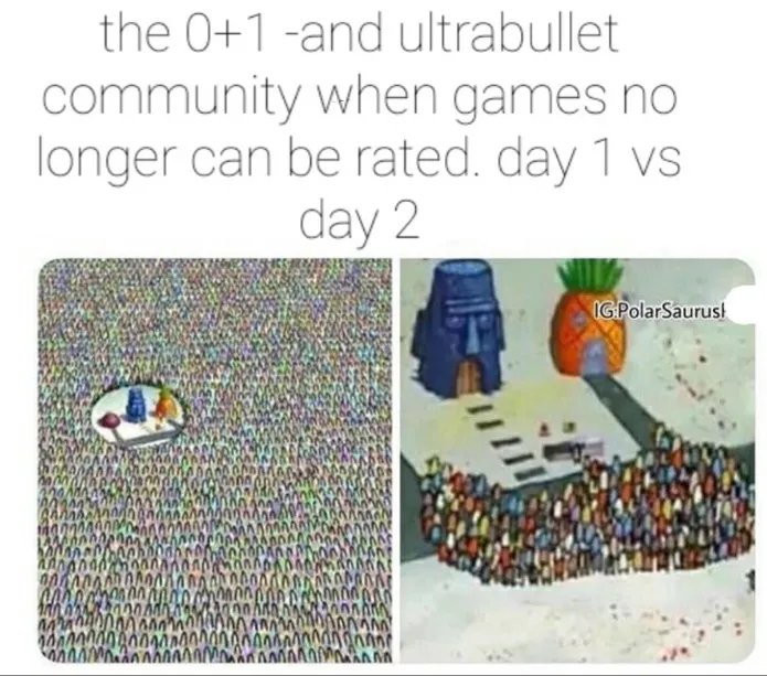 some thoughts and memes around the variant racing kingsthis is a bit old news but lichess banned timecontrols like 0+1 and 1/4 to be rated. they were really popular and i usually saw alot of arenas and gameseeks in the lobby every day. but bruh, literally the day after they banned it to be rated they all just vanished!