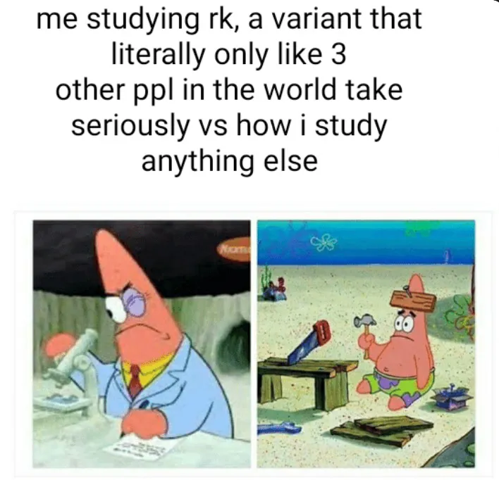 i genuinely believe that rk is the most enjoyable when you play several different openings than just like the exact same ones every single time lol. tho then again i can understand why some people chooses to only play the same because yea, u can get very good at that one 'special' opening and outprep people easily and like get quick wins.